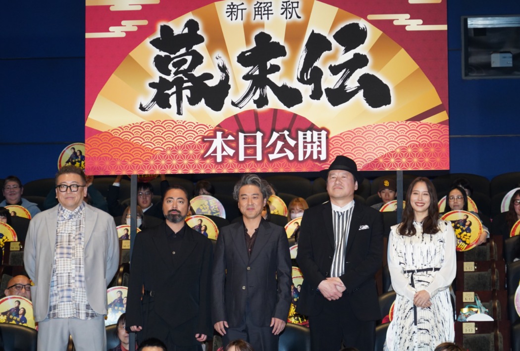 映画『新解釈・幕末伝』の初日舞台挨拶が12月19日、都内にて行われ、俳優のムロツヨシ、佐藤二朗、山田孝之、広瀬アリスと福田雄一監督が登壇。福田組ならではの大暴走トークで観客を盛り上げた。