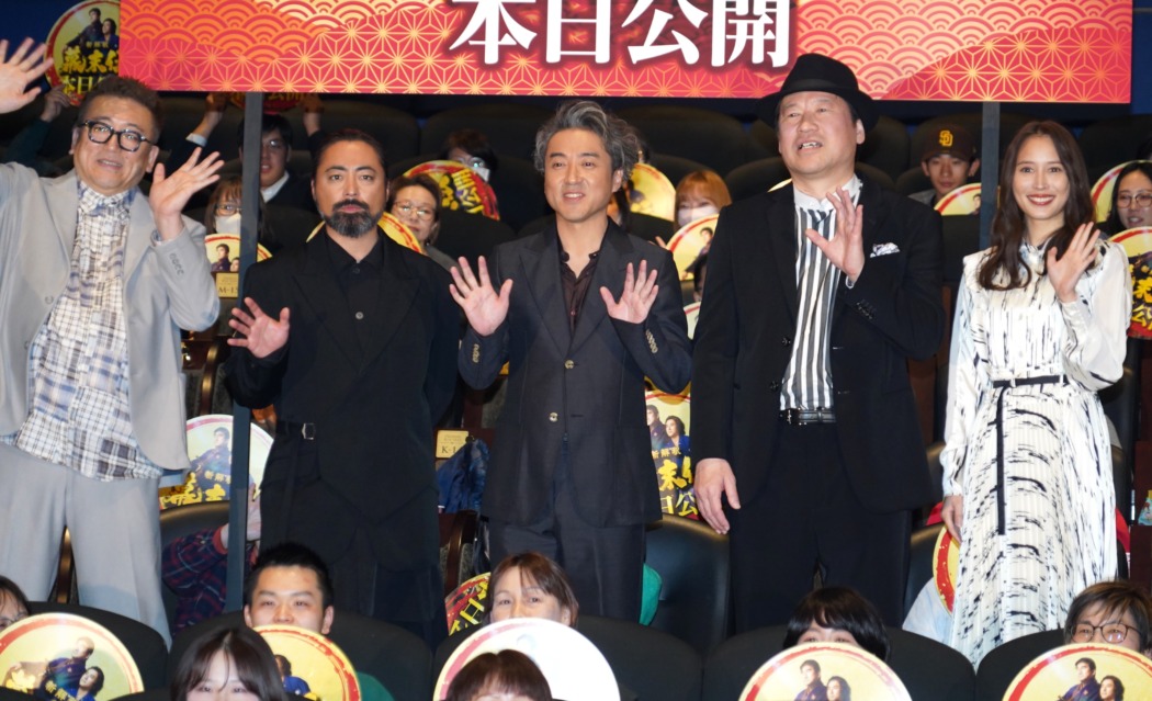 コロナ禍の中、ムロが思いついたアイデアを福田監督に掛け合い約3年かけて映画化したという本作。満席で迎えた初日に主演のムロと佐藤も大感激。ムロは「悲劇よりも喜劇が勝つこと、喜劇が時代を動かしたかもしれないという希望を皆さんとこの映画を通して共有できたのでは」。