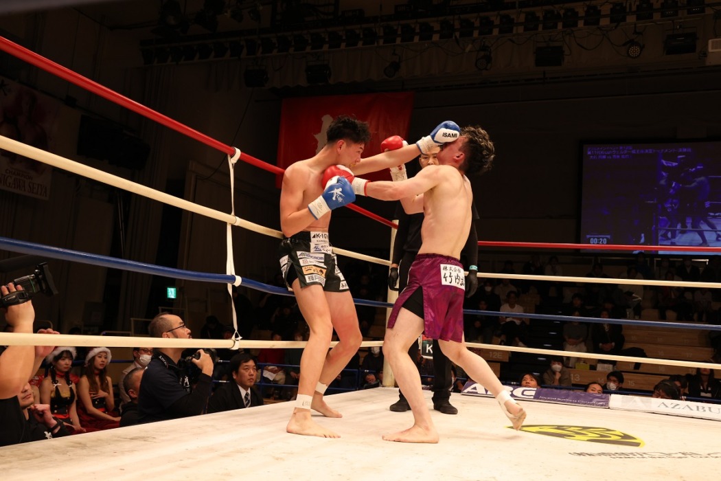 2R、齋藤は距離を詰めてワンツー、ヒザ。大石も右カーフ。距離が詰まりブレイクがかかる。齋藤は前に出てパンチを連打。大石も下がらず組み合う展開が続く。大石にホールディングで注意が出る。再顔後、やはり詰めてパンチを連打の齋藤。大石は蹴りを封じられ、組み付いてしまう。ブレイク後、やはり前に出てパンチ、ヒザの齋藤。組み止めてしまう大石にホールディングにイエローカードが出る。再開後も前に出る齋藤はパンチの連打とヒザ。互いに下がらず押し合いのままゴング。