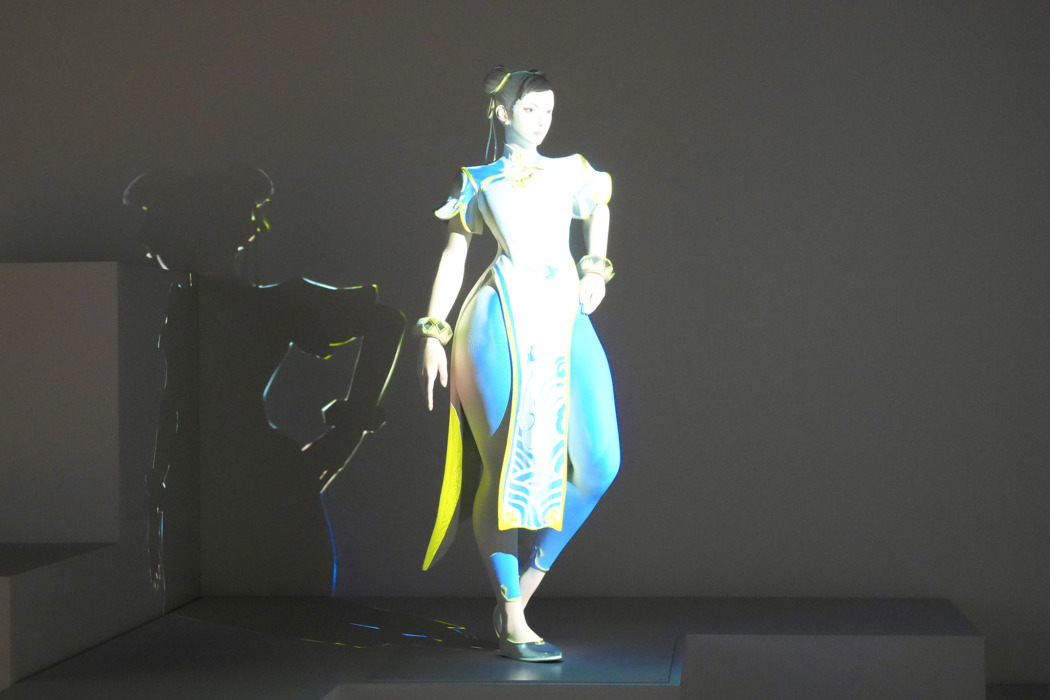 上:「大カプコン展 ―世界を魅了するゲームクリエイション」より石膏像にプロジェクションマッピングを投影した春麗/下:1980年代から現代までのカプコンとゲームの歴史を振り返る「ヒストリー」コーナー