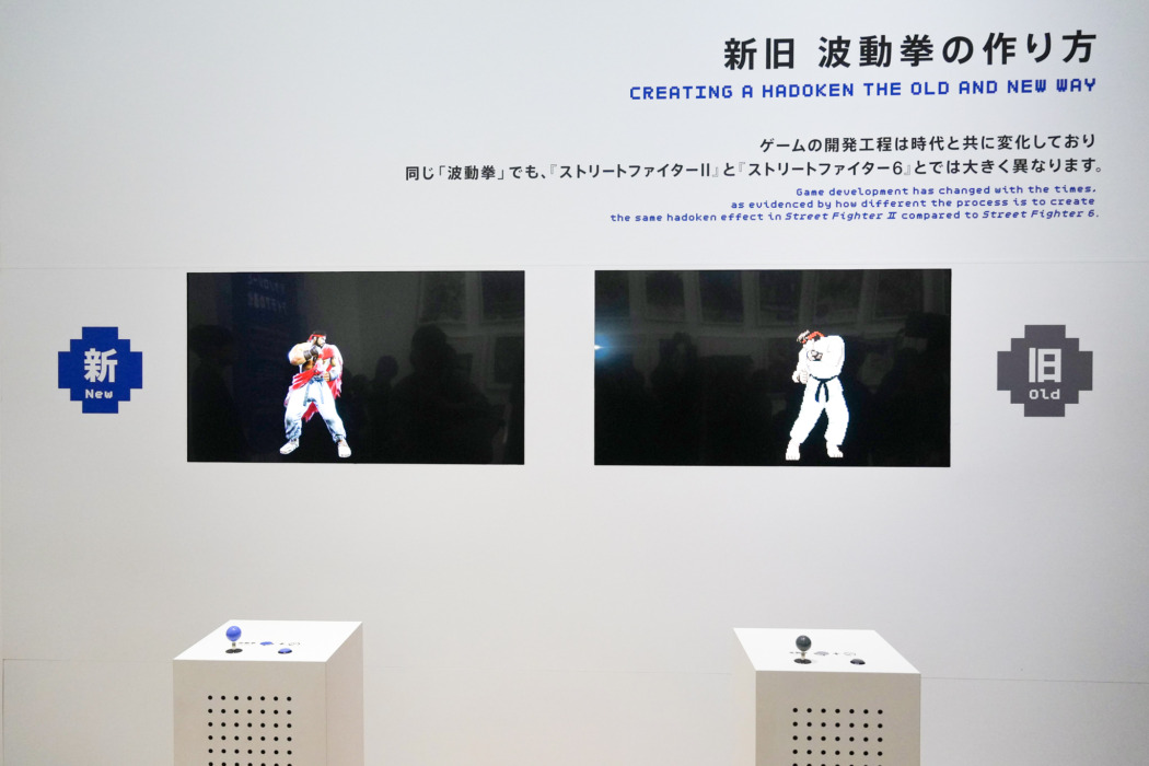 「ROUND 2」は、来場者が実際に体感して楽しめる体験型展示が盛りだくさん。『ストリートファイターⅡ』と『ストリートファイター6』の波動拳を比較できる「新旧 波動拳の作り方」、鏡のようなモニターの前で表情を変えるとキャクターの表情が連動する「フェイシャルトラッキングミラー」、懐かしの8bitサウンドから最新の立体音響まで体験できる「サウンドシアター」、タブレット端末でドット絵制作ができる「カプコンピクセルラボ」など。