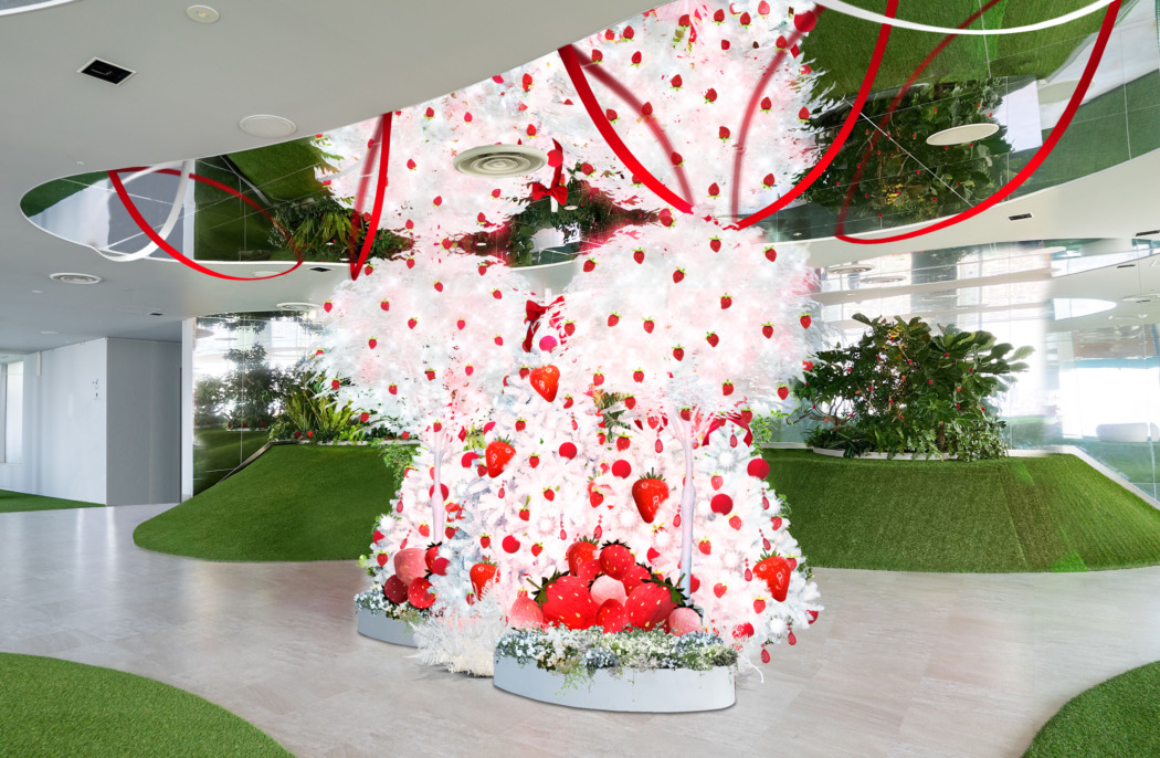 “いちごが実る冬の空の公園” をイメージし、白やスカイブルーを基調に、真っ赤ないちごを散りばめた装飾を展開している。