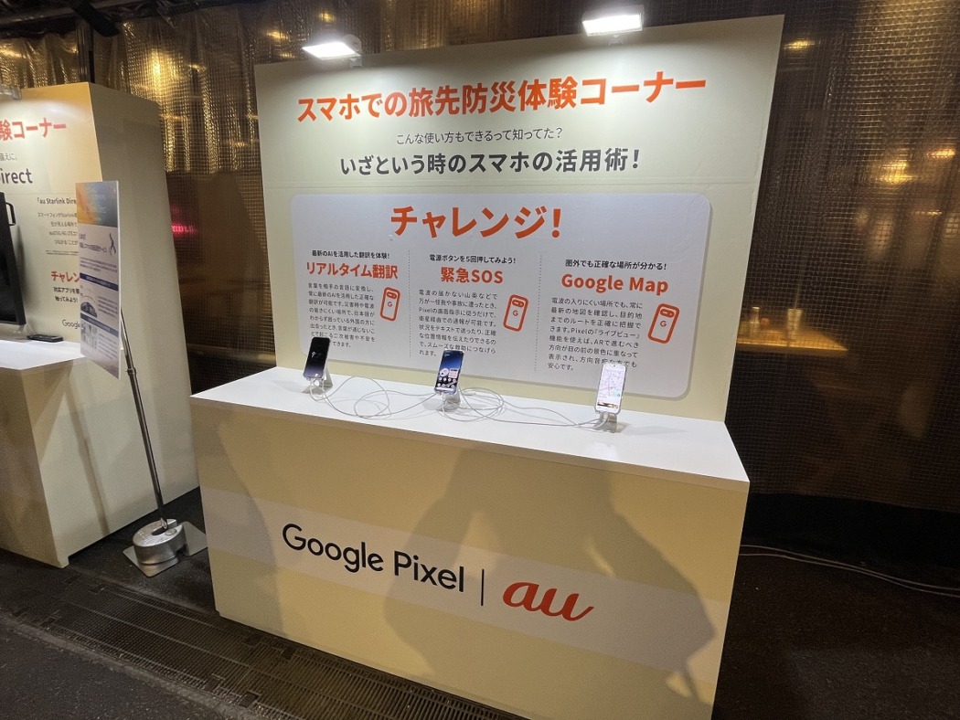 また「スマホでの旅先防災体験コーナー」ではリアルタイム翻訳、電源ボタンを5回押す緊急SOSの発信の仕方、圏外でも自身の位置を確認できるGoogle Mapや空が見える場所なら圏外でもスマホが使えるという「au Starlink Direct」の活用法を紹介。