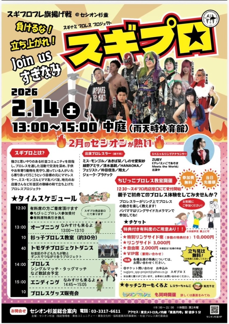 会場となるセシオン杉並では来年2月14日と15日に「親子でHOT!温まろう セシオン冬のマルシェ」を開催するが、その初日にスギプロがイベントプロレスを行う。試合は4試合程度で、そのほか、リング上でプロレスラーが指導するプロレス教室、トモダチプロジェクトダンス(杉並区の子どもたちが歌とダンスでつながり合うプロジェクト)、プロレスグッズ販売会を予定。元アクトレスガールズの清水ひかりさんのお菓子屋さんを始め、キッチンカーも多数出店。杉並区のマスコットキャラクターのなみすけも来場する。