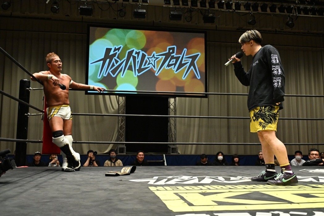すると意を決した中村がリングインし「僕は悔しいんですよ。年内最終戦、ビッグマッチの後楽園のメインが他団体の望月さんに締められて。だから、たまらず挑戦表明しにきました。僕は望月さんのようにキャリも実績もない。でも、あなたに1個だけ勝ってることがあるんですよ。それは勢いだ。望月さん、いや望月成晃、僕が今まで負けて来たガンプロ全員の思いを背負って、次、あなたの前に立ってやります。いい返事を聞かせてください」とアピール。