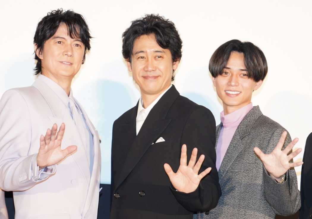 早くも動員25万人の大ヒット、先日放送のドラマもSNSでトレンド1位という高評価に福山、大泉はじめ一同も感激。さらに本作の主題歌をともに手がけた福山と稲葉浩志が今年の『紅白歌合戦』でパフォーマンスをすることも発表されており、福山は「稲葉さんと音楽づくりができるなんてまずないこと。それが紅白でパフォーマンスできるなんて。24日にはデジタルリリースもさせていただいて…」と感激を語っていたが、ふと「キンプリも何かやってたね」と、永瀬のグループKing & Princeの新作アルバムとリリース日が被ったことをチクリ。大泉も「当ててきたのか! 困るんだよ」と乗っかり、会場は大爆笑。
