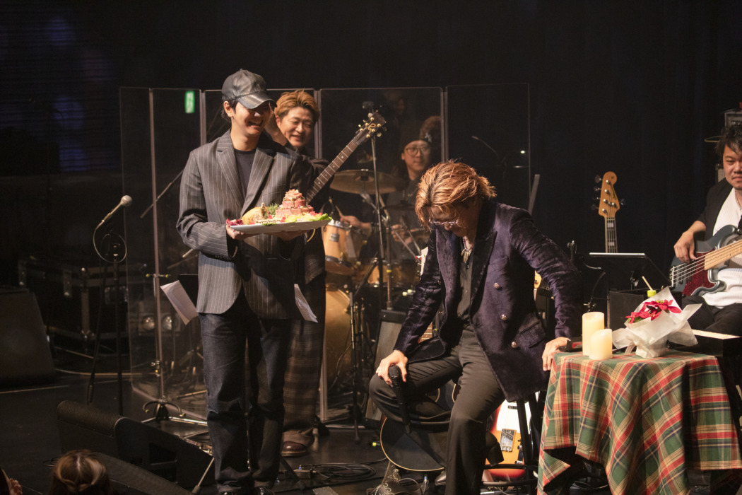 そして「そろそろ曲を」と歌い始めようとするとハッピーバースデーの曲が流れ、片寄涼太が肉ケーキを持ってサプライズで登場し、会場は拍手と大歓声で沸いた。「(会場に)来てくれてるのは知ってたけど。出てくんなよ(笑)!」「去年は(中務)裕太くんが来たんでしょ?」など言葉を交わし、会場全体でバースデーソングを歌ってお祝い。そんな片寄について「この間ソロライブを観に行ったけど、すごく大人。ジャズ/クラシックの要素が似合うし、華やかさや表現力。自分とは違った豊かさがある」などとコメントし、「生まれも育ちも違う僕ら2人が、『VOCAL BATTLE AUDITION 2』で偶然同じ曲を歌っていた」と紹介して、EXILEの「Angel」を披露。優しく熱さも感じさせるエモーショナルなボーカルは、どこか大人の男の色気をただよわせた。そしてアンコールのラストには配信されたばかりの「チキンライス」を、客席に向かってひとりひとりに語りかけるように歌ったKAZ。最後は手を左右に揺らしながら「ラララ〜」と大合唱。「皆さんよいお年をお過ごしください」との言葉で、3年目となった年末のビルボードでの夜を締めくくった。
