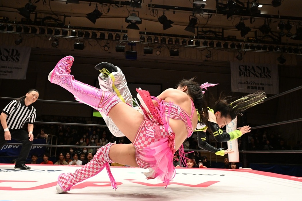 敗れた鈴芽は「未詩さーん、私、プロレス大好きです! 今回は届かなくて、プリンセス・オブ・プリンセスの重みは結局まだ知ることができなかったし…。未詩さんが覚悟持って背負ってるものの大きさもまだ分かんないけど。でも、多分それは一人で背負うものじゃないから、みんなで背負うものだと思うから。私は何度でも何度でも何度でも未詩さんのこと刺しにいきます。一緒に引っ張りにいきます。ありがとうございました。(プリプリのベルトはあきらめない?)あきらめないし、もっともっと欲しくなりました」と今後のベルト獲りに手応えをつかんだようだった。
