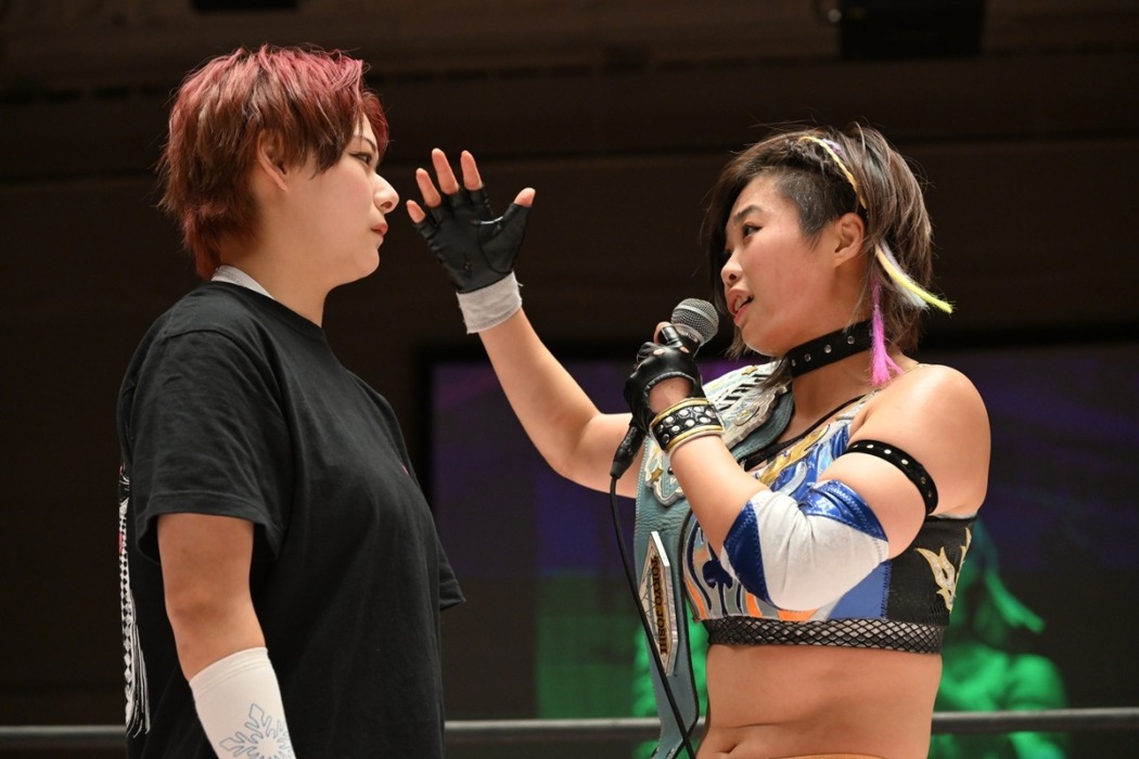 挑戦表明の凍雅は「2025年はHot Shotとして、まなせ(ゆうな)さんがいたからこそ成長できたって思う部分が多くて。一人でも強いんだぞっていうの見せたいなって思って、挑戦表明したんですけど…。自分にとって覚悟が決まってないと挑戦表明できないから、覚悟は決まってるけど、それをタイトルマッチまでに調整できたらいいなって思ってます。挑戦(表明)したからには一発目で獲るぐらいの気持ちで挑みたいなと思ってます」と意気込んだ。