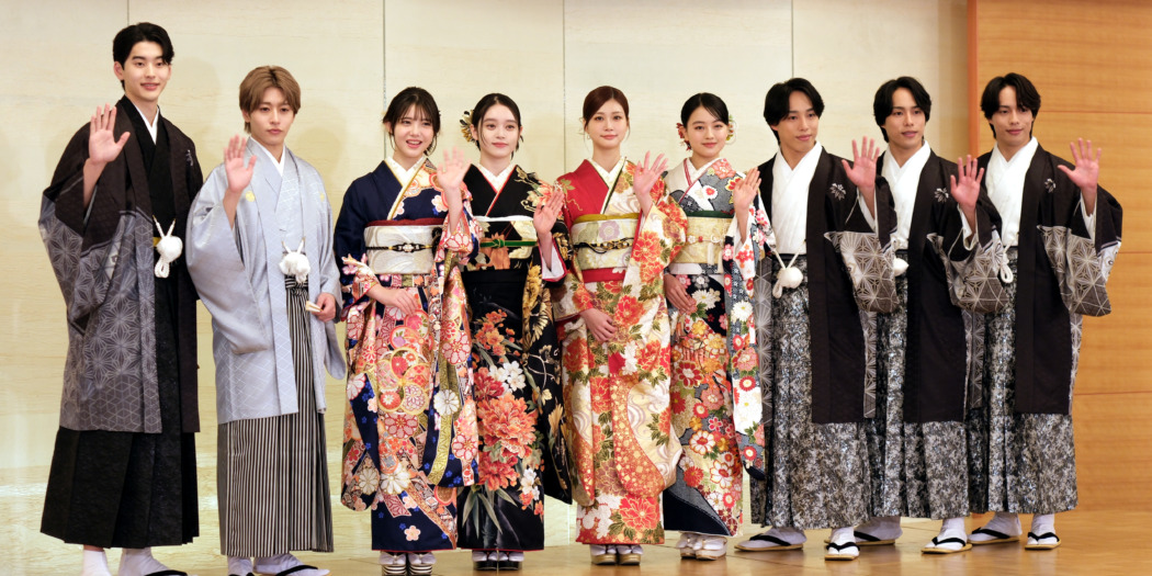 新年恒例となった晴れ着お披露目会には、生見、髙石、上坂のほか、松尾そのま、佐藤三兄弟、荒井啓志、石川愛大が参加。それぞれの個性にあった晴れ着で登壇し、くるりとまわってポーズした。