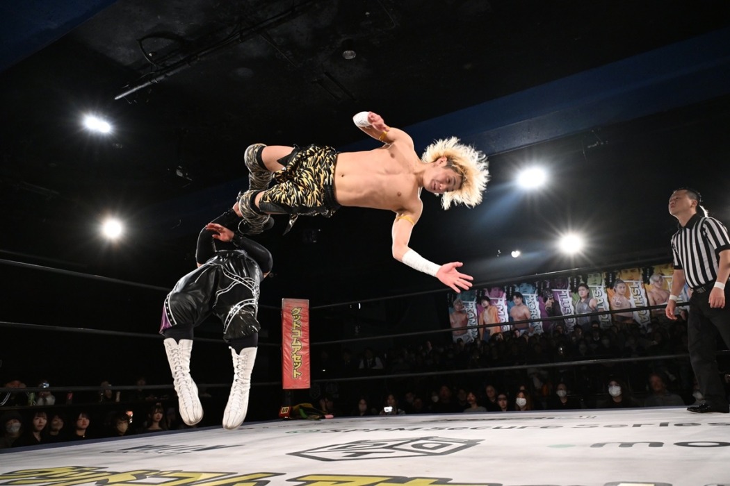 また、同じAブロックでは石田有輝が高校2年生の佐藤大地と激突。佐藤は昨年4月にHEAT-UPから移籍し、「DGC」初出場。両者のデビューは1カ月違いで、プロレスキャリアでは同期となる。石田がフライングどすこい、雪崩式ブレーンバスター、小股すくいスープレックスで攻め立てると、佐藤はミドルキック、ジャーマンで反撃。石田が猫だましからどすこいクラッチも2カウント。佐藤はファイアーサンダーから重爆マッドスプラッシュを投下してトドメを刺した。佐藤は「勝ったぞ! この勢いで2試合目、3試合目、4試合目勝って、優勝するよ!」と優勝宣言した。