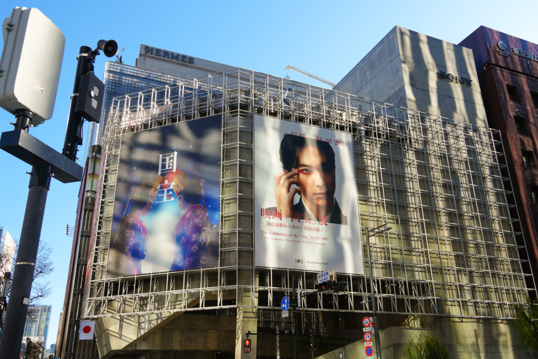昨年6月の公開以来、数々の記録を樹立しながらロングランヒットを続ける映画『国宝』。第98回米国アカデミー賞国際長編映画賞の日本代表作品に決定するなど、国内外で熱狂を生み出し続ける本作の世界観に没入し、その魅力を追体験する展示がGinza Sony Parkで始まった。数寄屋橋交差点に面したGinza Sony Parkの壁面には、超巨大な『国宝』のポスタービジュアルが掲出されて気分を盛り上げる。