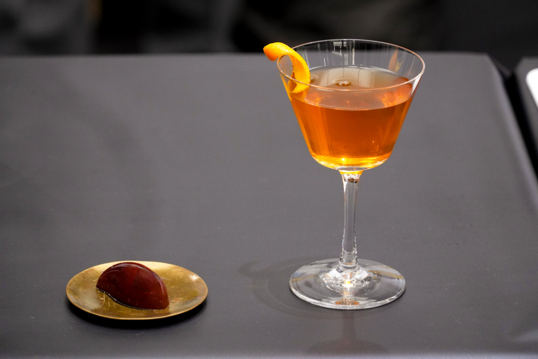 5回目となる “チョコ×お酒のマリアージュBAR” では、〈アトリエAirgead〉のBAR専用チョコレートに合わせたカクテルを提案。2月7~10日出店〈SUKIYABASHI SAMBOA〉は「檜ビターズ」、カカオリキュール、「SCARLET」、ベルモット、サントリー ウィスキー「知多」をステアしたカクテル「ベルベットアンバー」にBAR専用チョコレート「樽バニラ」に合わせた。