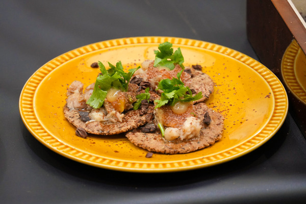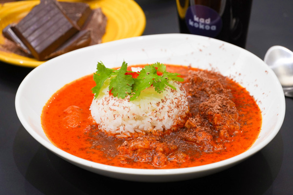 イートインでは〈メメントモリ〉の松屋銀座限定「Cacao’s Tacos」はカカオハスクを練り込んだ自家製トルティーヤにカカオニブと煮込んだ豚肉のカルニタス、トマトとカカオパルプのサルサソース、すりおろしたカカオマス、さらにカカオパルプをトッピング。〈ガートココア〉の松屋銀座限定「カカオパネーンカレー」は〈タイ・イサーン料理ヤムヤム〉のチキンのパネーンカレーにカカオ70%チョコレートをすりおろし、松屋銀座限定「ダブルドウクッキーアイス」はハーフ&ハーフに焼いた人気アメリカンクッキーにバニラアイスをのせ、タイティーソースを合わせた。