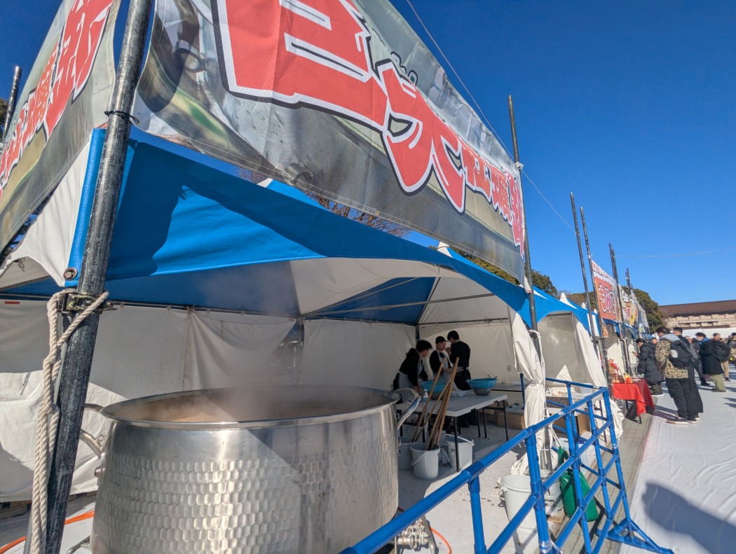 1周の最後に目に飛び込んできたのが湯気がもうもうとたつ巨大な鍋だった。大人が軽く数人入ってしまいそうな大きな鍋で、直径は約2メートルある。4日間のイベント期間中、瀬戸内産の牡蠣4万個を投入し、牡蠣鍋汁を作り続けるという。毎日先着200名に無料配布するという大盤振る舞いだが、限定数を超えても1杯300円で食べられる。