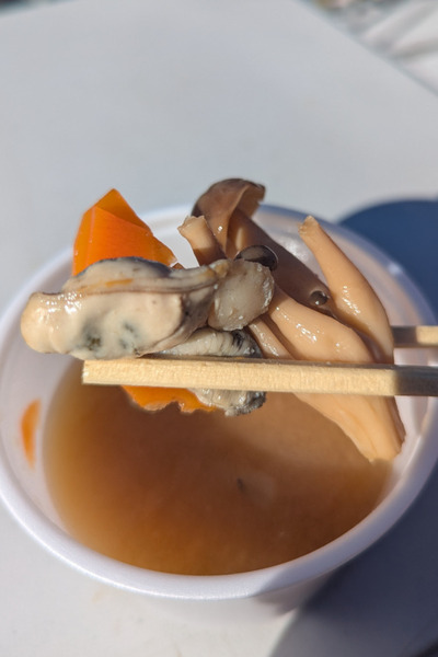 白い湯気に誘われて温かい牡蠣鍋汁のカップを受け取った。箸をいれると、根菜やきのこが入っていて、牡蠣もふたつ入っていた。ゆっくりと口に運ぶと、なんと滋味深いこと!牡蠣の出汁のうまみが冷えた体に染みわたる。