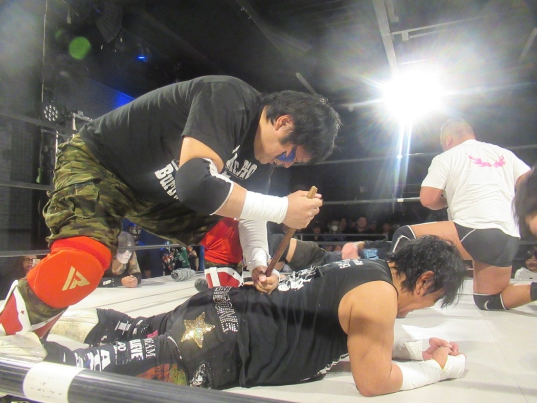 ポーゴが大仁田の背中にほうきの柄をぐりぐり
