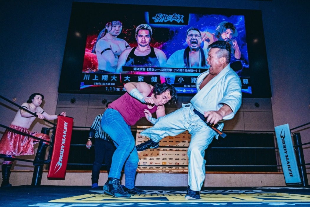 レースの合間に全5試合が行われ、第4試合には“ミスターPRIDE”小路晃が参戦。元キック王者・前口太尊と格闘タッグを結成し、大家健&川上翔大と対戦。小路はいきなり大家にキムラロックを決め、ローキックを連打。前口は大家にミドルキック連打。小路は川上にワキ固めを決めるもカット。ならばと小路は川上に一本背負い。STOから腕十字をガッチリ決めてタップを奪った。