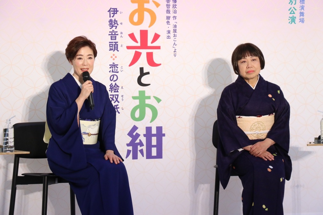 また寺島は「『浅草パラダイス』の時もそうだったんですが、 直美さんは台本があっても台本がないような感じでやっていた。勘三郎さんも柄本さんもそうだった。なんていうか、人間で見せるみたいなそんなお芝居になってしまうんですよね、すごすぎるから。だから今回、やっぱり内容はもちろんありますけれども、直美さんと私がやらせていただくことで何か新しいセリフ以外のことが楽しくなっていけば、もっともっとこの話も膨らんでいくのかなと思ったりしますし、直美さんとだったらそれができるような気はします。いったん恋がたきになったりするんですけれども、本当に嫌いで恋がたきになったわけじゃなく、お互いにリスペクトがありながらどんどん変わっていくさまというのがとてもよく描けているので、すごく楽しみですし『伊勢音頭』というのはどうしても悲しげな話になりますけれども、今回は喜劇と書いてありますので ぜひ直美さんの喜劇をお楽しみください」などとかつての共演時の演技を振り返りながら、藤山のすごさを口にした。