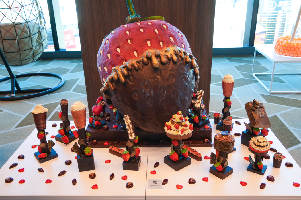 上:渋谷スクランブルスクエアScene12にて開催中の「100 WORDS OF GODIVA 〜ブランドを紡ぐ言葉たちの展覧会〜」/下:エグゼクティブシェフ・ショコラティエのヤニック・シュヴォロー氏によるチョコレートピースのオブジェ