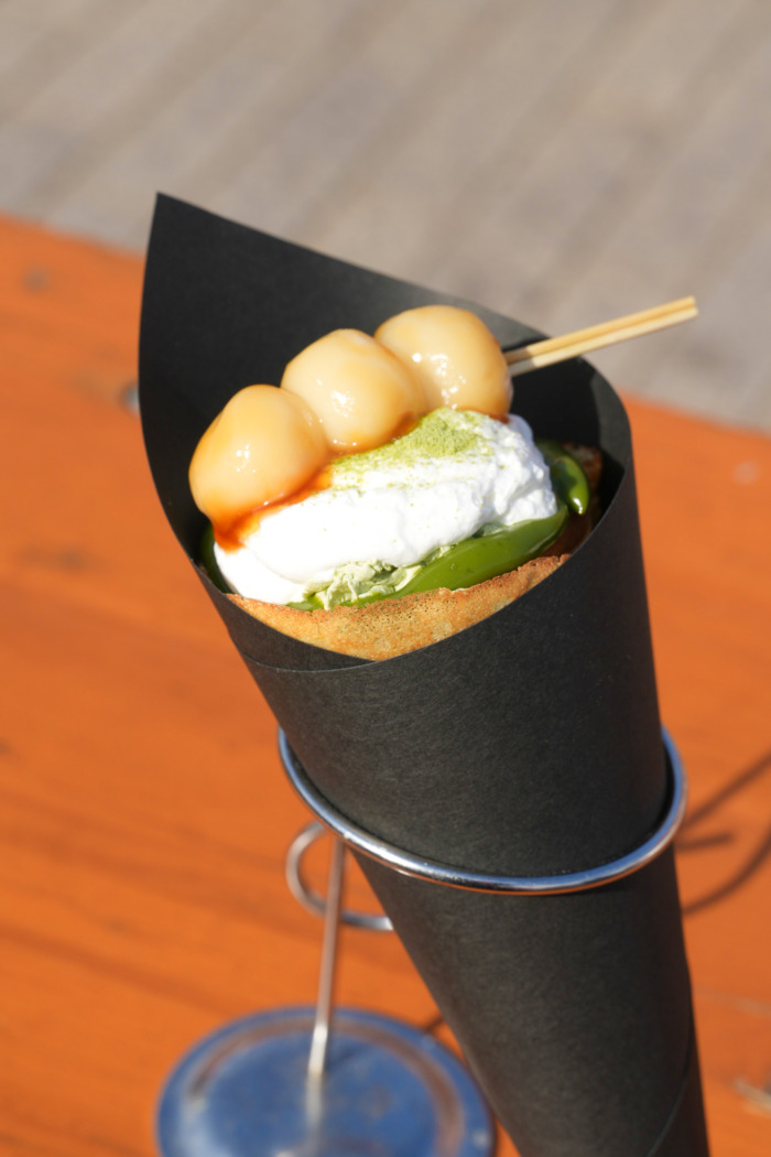 甘じょっぱいみたらしだんごが乗ったウ 茶匠くるり庵「濃厚みたらし抹茶クレープ」1200円(税込)