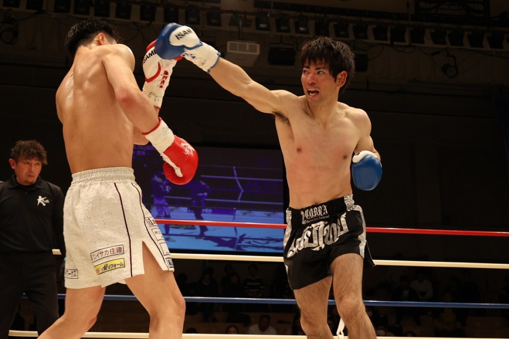 2R、関口は距離を詰めて細かいパンチを上下に打ち分け。がら空きの森本のボディーに強烈な左右のボディーが突き刺さる。森本も合間にパンチを返す。森本はバックブローをヒットも単発。関口は上下にパンチを打ち分け、左ミドル。圧をかける森本だが、関口は左ボディー。ガードを固める森本の中に入りボディーにパンチを連打の関口。距離が開くと遠めから右ストレートの関口。