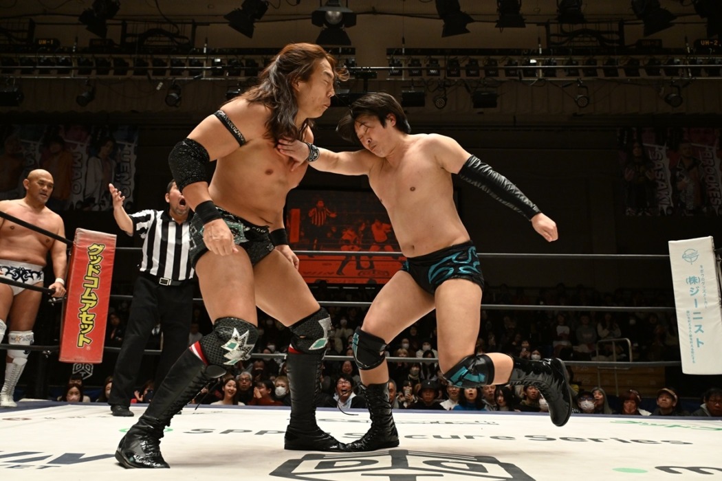 DDTプロレスが1月25日、東京・後楽園ホールで「MISSION IN BATTLE~新春絢爛~」を開催した。感染性結膜炎のため、大会2日前に欠場が決まった武知海青(THE RAMPAGE)の“代打”として緊急出陣したTo-yがKONOSUKE TAKESHITA&秋山準を相手に敗れたものの大奮闘した。