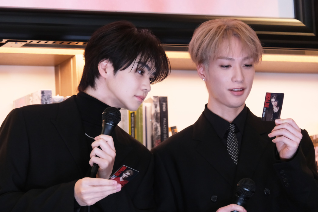 説明を担当した吉野が自身が演じた高城司のカードを手に「思った以上にしっかりしてます。硬いです。なので保管しやすいです。ランダムだから集めたくなりますよね、全何種類あるか分かりませんけども……」と、しっかり説明。