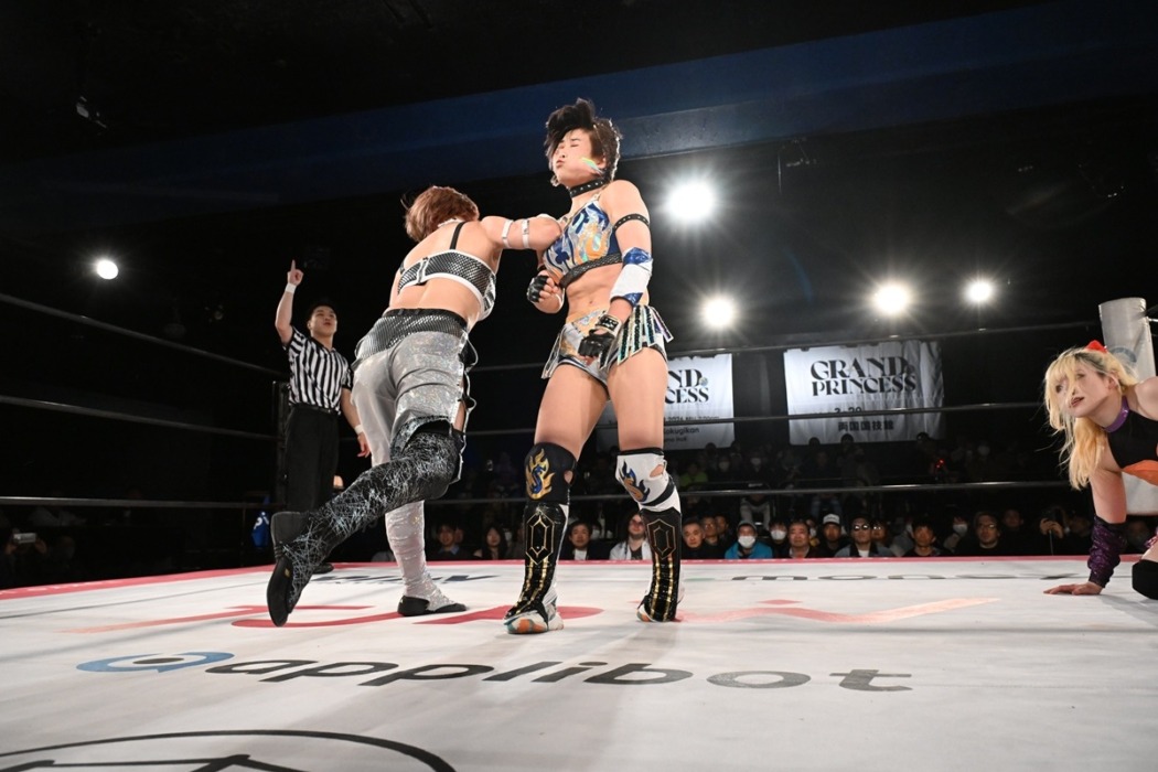 そして、この日の第5試合でMIRAIはサラ・フェニックスと組み、凍雅&千花と対戦。先発したMIRAIと凍雅はレスリングの攻防。その後、MIRAIは凍雅にドロップキック、バックフリップを叩き込んだ。両軍、一進一退の戦いが続くなか、再びMIRAIと凍雅が対峙すると、激しいエルボーの打ち合いに発展。凍雅はフォールアウェイスラムでMIRAIを投げつけた。七瀬の稲荷鳥居・改を切り返したMIRAIは、すてきMIRAI☆ロックで締め上げてギブアップを奪った。
