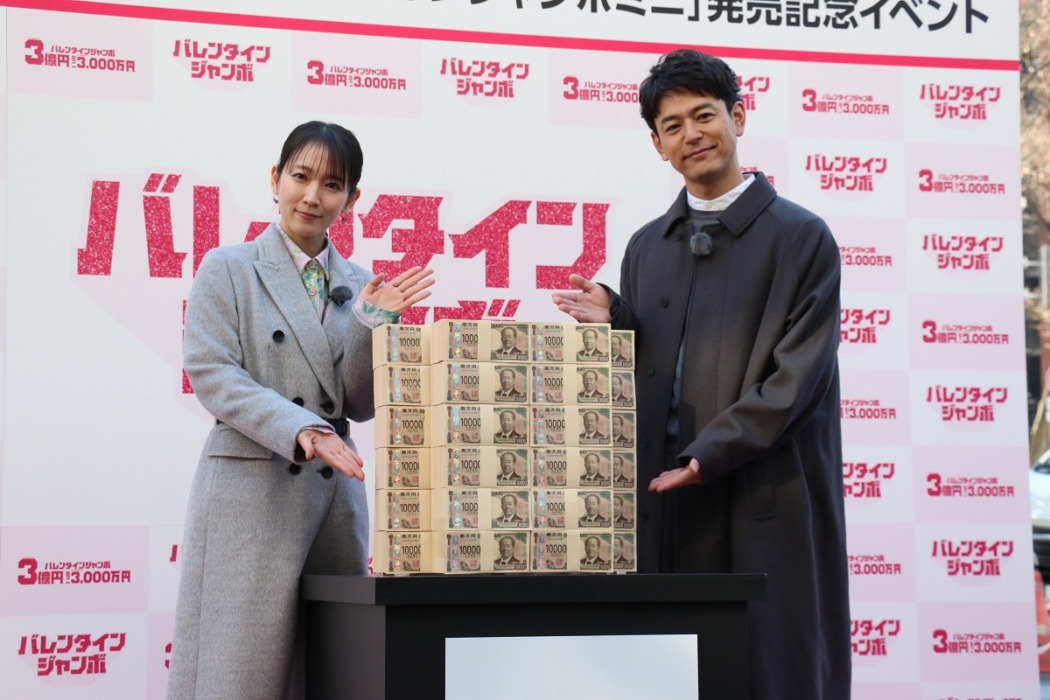 2人がPRした「バレンタインジャンボ宝くじ」と「バレンタインジャンボミニ」はこの日から3月6日まで発売。バレンタインジャンボ宝くじ1等賞金が2億円、1等の前後賞が各5000万円で1等・前後賞合わせて3億円、2等賞金も1億円。前年と比べて1億円以上の当せん本数は2倍、5万円の当せん本数は7倍となっている。バレンタインジャンボミニは1等賞金が2000万円で1等・前後賞合わせて3000万円となっている。