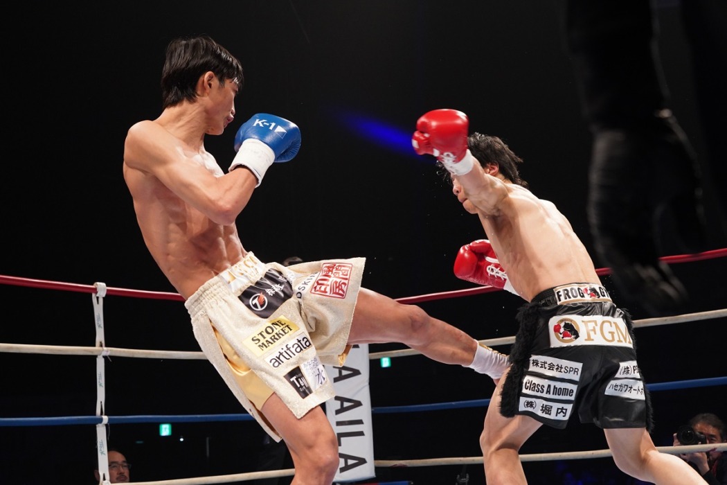 遠めの距離から左ローを放つ大久保(撮影・三田春樹)