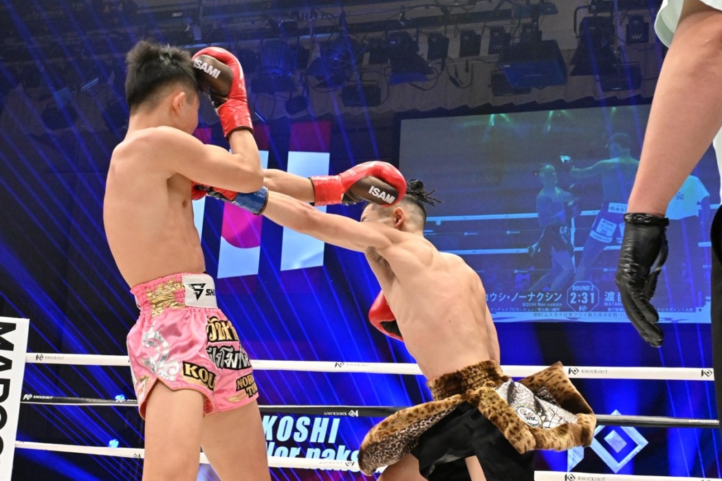 2R、詰めるコウシが右ミドルを連打。渡部は左ストレート。コウシは右ハイを飛ばす。渡部は左ストレート。コウシの出血が激しくなりドクターチェックが入る。ドクターが試合続行不可能と判断し試合を止めた。