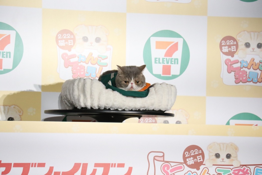 試食前には助っ人としてセブンイレブンジャパンの公式SNSにも登場している猫店長のポセイドン君が登場。「ちょっとだけ舌が出てるのが本当に可愛い。制服もすごく似合ってますし。この制服、うちの子にも着せたいなって思っちゃいます。緊張してたので猫の手も借りたいと思っていたところだったのでポセイドン君が来てくれてちょっと心が和みました」と目尻を下げる桜井。