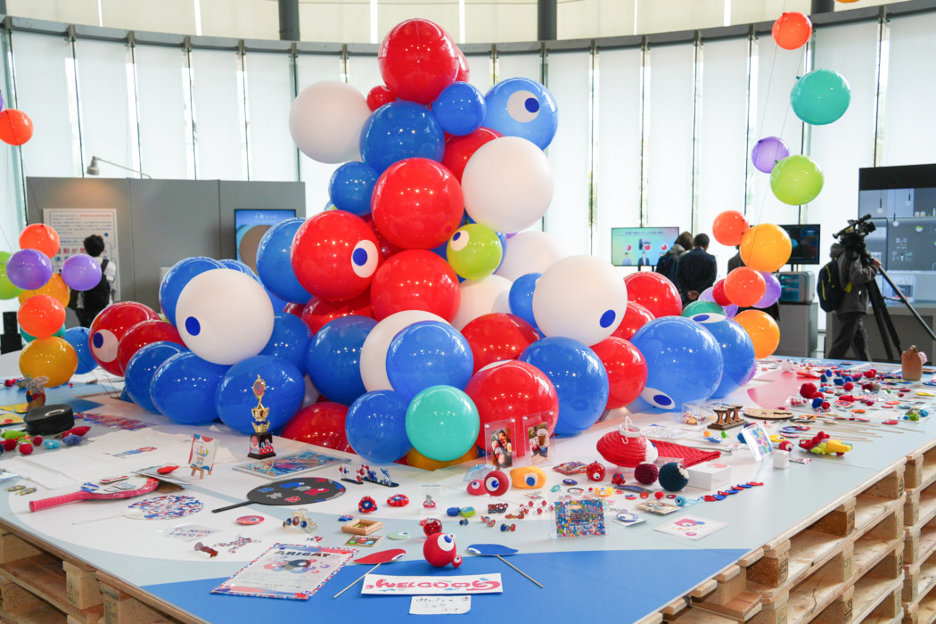 大阪・関西万博のデザインシステム「EXPO2025 Design System」の提案資料や会場内のグラフィック、サイン、装飾、サウンドスケープなどの関連資料も展示。デザインシステムの一部はSNS上で “こみゃく” と呼ばれ、多くの人によって爆発的な広がりを見せた。会場の中心には一般から寄せられた二次創作と公式のバルーンが展示され、“こみゃく” 現象の広がりを感じることができる。