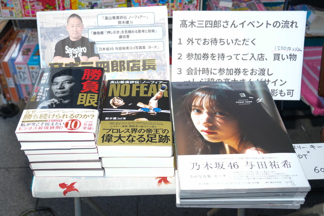 DDT髙木三四郎、3月閉店 “本屋プロレス” 書店で一日店長「聖地といってもおかしくない」 2026.02.21 Vol.Web Original 今日の東京イベント 髙木おすすめ『勝負眼』(藤田晋著、文藝春秋)、『髙山善廣評伝 ノーフィアー』(鈴木健.txt著、ワニブックス)、田祐希3rd写真集『ヨーダ』(光文社) #DDT #一日店長 #中井 #伊野尾書店 #髙木三四郎 <<< 1 2 3 4