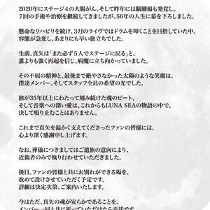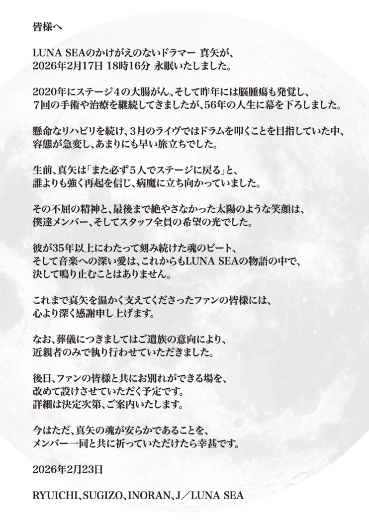 LUNA SEAの真矢さん死去 20年に大腸がん、昨年に脳腫瘍も発覚 メンバーが悲痛のコメント 2026.02.23 Vol.Web Original エンタメ #LUNA SEA #コメントあり #大腸がん #真矢 #脳腫瘍 #訃報 <<< 1 2