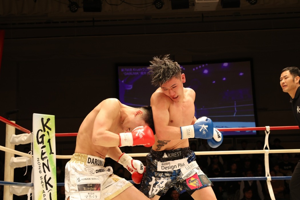 1R、オーソドックスの構えのDARUMAとサウスポーの石田。DARUMAの右ハイに石田は左ボディーストレート。石田の左ミドルにDARUMAがパンチを合わせる。DARUMAは右フック。石田は右フック、左ストレート。DARUMAは右ミドル、石田は左ストレートを返す。石田は一気に詰めて左ストレート、右フック、左ストレート。距離が詰まりブレイク。DARUMAh右インカーフ、石田は左ストレート。石田は詰めて左ストレート。DARUMAは右ボディー。距離が詰まり組み合う。両者にホールディングの注意。DARUMAは左カール、右ハイ。DARUMAの右ストレートに石田がカウンターで左ストレート。