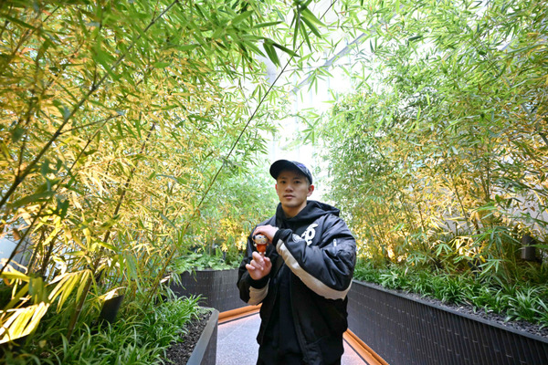 足を踏み入れると、サラサラと笹が揺れる音。心地よい音に耳を傾けながら、小道に沿って窓際へ向かいます。数段の階段を上ると、目の前に東京湾と空のブルーが飛び込んできました。偶然にも誰もいなくて眺望を独占! 窓キワキワまで歩いていった翔平さんですが、「……うわっ、見えちゃった」と後ずさりし、ゆっくりとベンチに腰かけました。