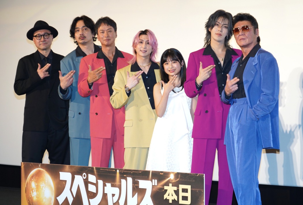 殺し屋のダンスチーム・スペシャルズの面々を演じた主演の佐久間をはじめ、椎名桔平、中本悠太(NCT)、青柳翔、小沢仁志が劇中同様、色とりどりのスーツとサングラス姿で登場すると、観客たちも持参したサングラスをかけてメンバーをお出迎え。佐久間も「緊急ミッションということで急にお願いしたのに…皆さんの愛を感じます!」と大感激。
