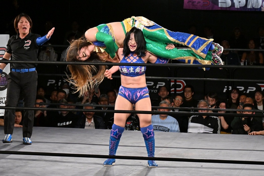 彩羽のパンチを脇固めにとらえるMIRAI。左腕も固めてギブアップを迫るが、なんとかロープの彩羽。ラリアットをかわした彩羽がニールキックをMIRAIの顔面に。ここから彩羽とMIRAIが交互にブレーンバスターで投げ合う。最後は投げられたMIRAIがエビ固めもカウントは2。
