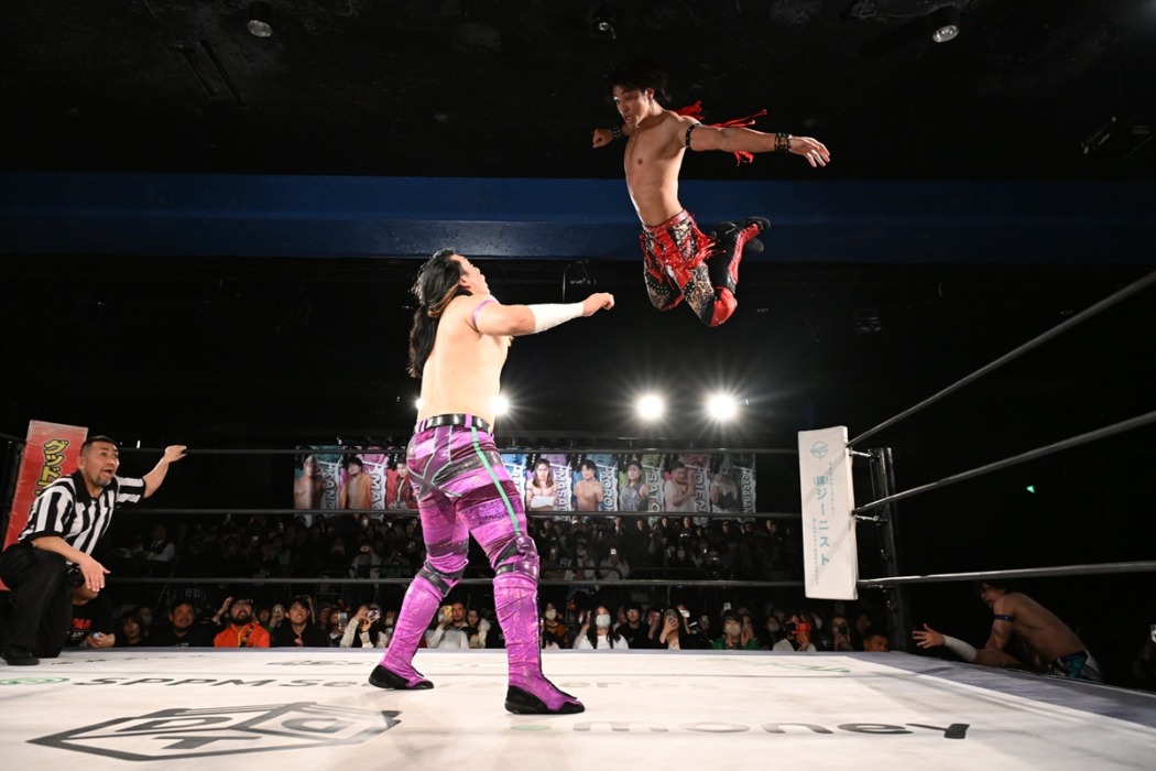 試合は上野と高鹿でスタート。続いて武知と正田の展開になる。レスリングからロープワークと互いに一歩も引かない中、武知がドロップキックで正田を吹っ飛ばす。