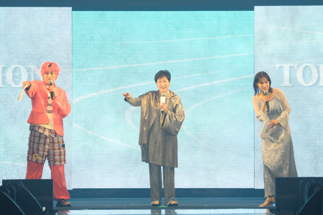 都知事はMCを務めるお笑いコンビのEXITと鷲見玲奈とトークステージを展開。話題は、都の若者へのさまざまなサポートで、看護師らが10代の体や心の悩みに答える、とうきょう若者ヘルスサポート(わかさぽ)、就職、出会いから結婚、子育てといったライフステージの変化に対応する切れ目のないサポート、そして働く女性の活躍を促進する様々な取組み「女性活躍の輪」(Women in Action)にも及んだ。