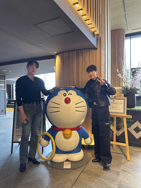 ドラえもんとメンズ2人の写真です!笑🔵🔴