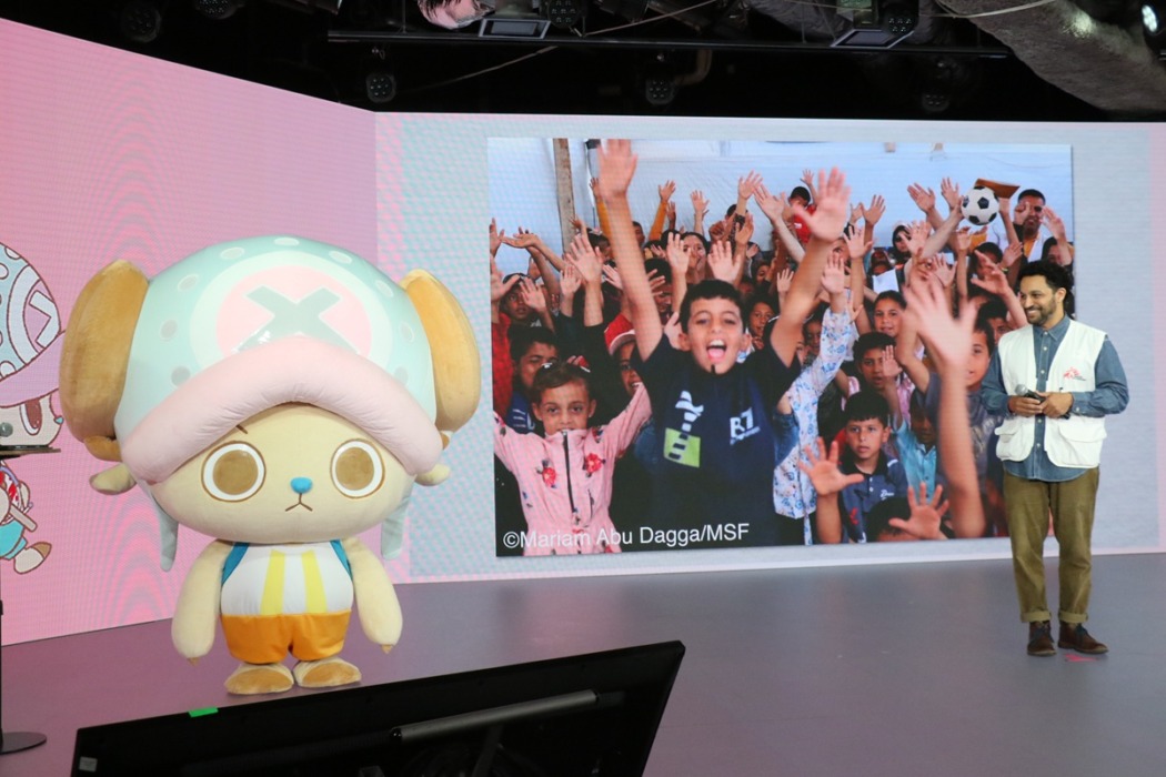 発表会でアブデルモネイム会長は「ようこそチョッパー。世界でたくさんの人の命を守るために、国境なき医師団の仲間になってくれてありがとう」とチョッパーに呼びかけ、そして関係者への感謝の言葉を述べたうえで「この取り組みは、ワンピースチームの皆さんが国境なき医師団の根本にある人道主義に深い共感を示してくださったことで実現しました。世代も文化も大陸も越えて結ばれるこの連帯は、世界の厳しい環境の最前線で医療を届け続ける私たちにとって非常に大きな意味を持ちます。今回のコラボレーションの目的は、国境なき医師団が行う医療・人道援助活動をより多くの方に知っていただくこと、そして、紛争、感染症、災害、医療から取り残された状況にある人々が直面する現実を広く理解していただくことです。チョッパーの参加によって、私たちの活動はより幅広い層へ、そして新しい世代の方たちへと届いていくでしょう。その方たちが新たな支援者、そして新たなスタッフになることを期待しています。何より象徴的なドクターであるトニートニー・チョッパーが、仲間として私たち国境なき医師団を応援してくれることを本当にうれしく思います。文化や人種や国籍を問わず、医療を必要とする人を助けたい。この思いはチョッパーと国境なき医師団で共通するものです。チョッパー、これから国境なき医師団の活動地を訪れ、君の目で見たことを多くの人に伝えてください。国境なき医師団にはたくさんの仲間が必要です。チョッパーを通して国境なき医師団の仲間が世界中で増えることを願っています」とチョッパーの活躍に期待した。