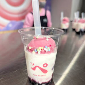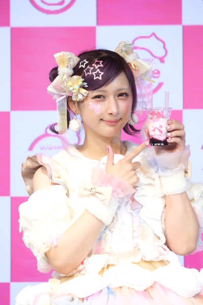 「ちょっと自我を出した」と笑うルック、映えへのこだわりも強調。「私のスイーツはビビットカラーとかが人気なので、カラーリングにこだわっています。まずはピンクのアイスを作っていただいて、紫のブルーベリーソースで、ちょっと自我を出させていただいて……しなこカラーを入れさせていただきました」と笑った。そこに加えた食感のあるカラフルなシュガーボールもこだわりのポイントのよう。「クリーミーなところも味わえるけど、シュガーボールのサクサク感というか食感も味わえるという、見ても楽しいし、食感も、混ぜる時も楽しいフラッぺになったと思います」