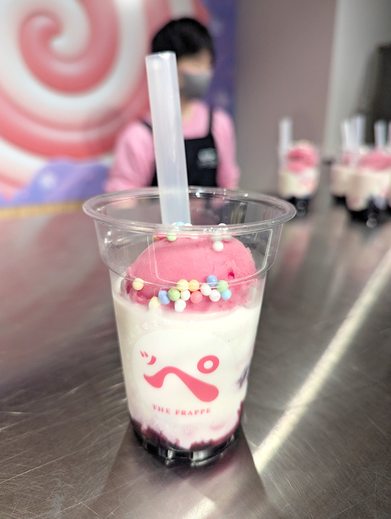 「ちょっと自我を出した」と笑うルック、映えへのこだわりも強調。「私のスイーツはビビットカラーとかが人気なので、カラーリングにこだわっています。まずはピンクのアイスを作っていただいて、紫のブルーベリーソースで、ちょっと自我を出させていただいて……しなこカラーを入れさせていただきました」と笑った。そこに加えた食感のあるカラフルなシュガーボールもこだわりのポイントのよう。「クリーミーなところも味わえるけど、シュガーボールのサクサク感というか食感も味わえるという、見ても楽しいし、食感も、混ぜる時も楽しいフラッぺになったと思います」