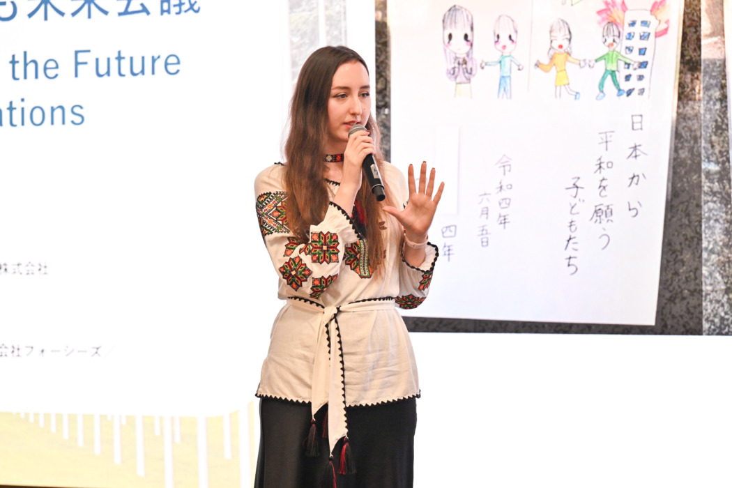2014年からロシアによる侵攻が始まり「2022年2月24日、ウクライナ人の運命が一変したロシアの全面侵攻が始まった。その日の朝5時、母から電話が来て “戦争が始まった” と言われ、生まれて初めて空襲警報と爆発音を聞いた」といい「空襲警報が鳴れば昼でも夜でも授業中でも避難しなければならず、子どもたちのために地下鉄に教室が作られている。学校、大学、病院、住宅、幼稚園、図書館がミサイル攻撃で破壊され、2万人以上の子どもたちが違法に連れ去られ、帰ることができたのは約2000人だけ」と厳しい現実を語ると、子どもたちは静まり返った。