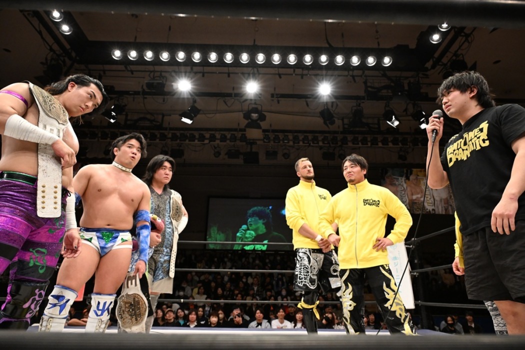 正田が「クリスとアントンさんとはチャンネル、ビビビっと合ってるなかで、HARASHIMAさんはデビュー戦の相手だし、チャンネルは合ってるんで断る理由はないですが…。おひなちゃん(葛西)、まだ1回も勝ってないんじゃないの?」と言うと、マイクを奪った葛西は「僕は去年デビューしてから自力で勝ててない。でも、あなたたち相手に自力初勝利できないことを意味しないから。タイトルマッチ勝てないことを意味しないから。僕の自力初勝利のお祝いとして、そのベルト、ファンドラのみんなで巻いて、最高のドラマティックドリームを見せてやる」と決意表明。これにより、4・15後楽園でのペールユースvsファンドラの王座戦が決定した。