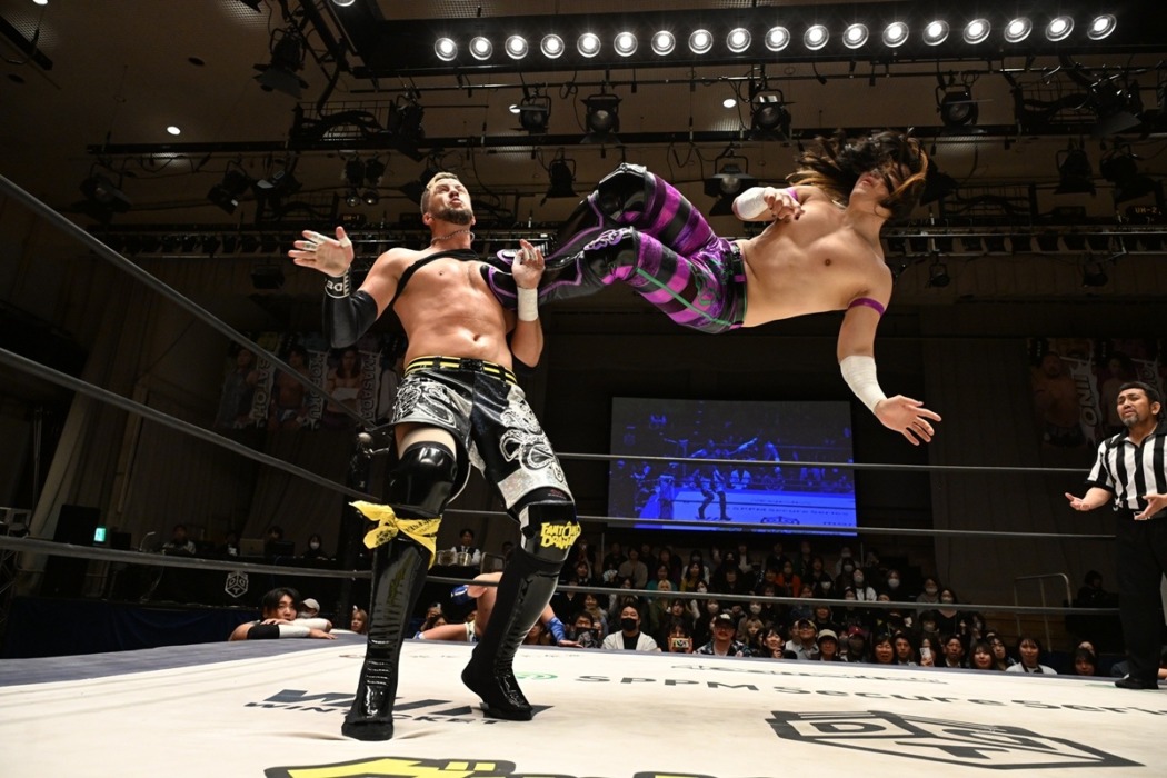 DDTプロレスが4月15日、東京・後楽園ホールで「DREAM LIGHTS 〜水曜日のDDTどうでしょう〜」を開催した。ペールユースの正田壮史&高鹿佑也&佐藤大地がファントム・ドラマティック(ファンドラ)のクリス・ブルックス&HARASHIMA&葛西陽向を下し、KO-D6人タッグ王座V2に成功。5・2札幌サンプラザでストレンジ・ラブ・コネクション(S.L.C.)のMAO&KANON&ビエント・マリグノが挑戦することが決まった。
