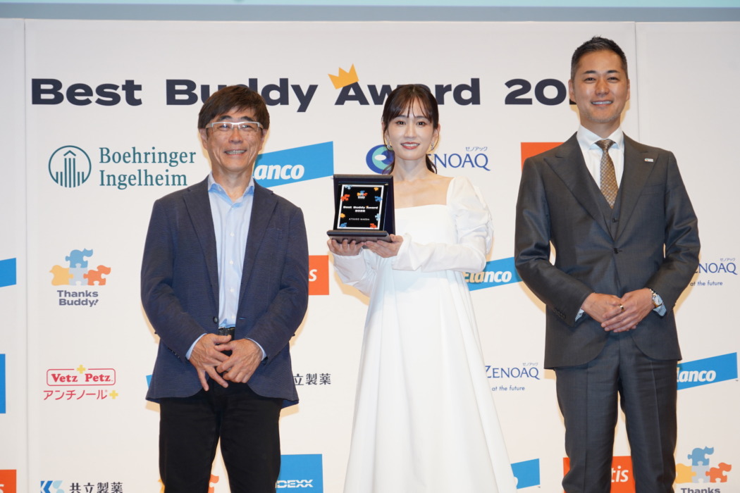 「現在、飼い猫との暮らしを、猫の個性を尊重しながら広めてくれている姿が、まさに人と動物の共生を体現している」として、第1回受賞者に選ばれた前田は「一番最初は小動物から始まって、ずっと飼いたいと願って20年ほど前にワンちゃんをお迎えしてから、今でもずっとなくてはならない存在として一緒に暮らしているので、こういった賞を頂いてうれしいです」と感激。